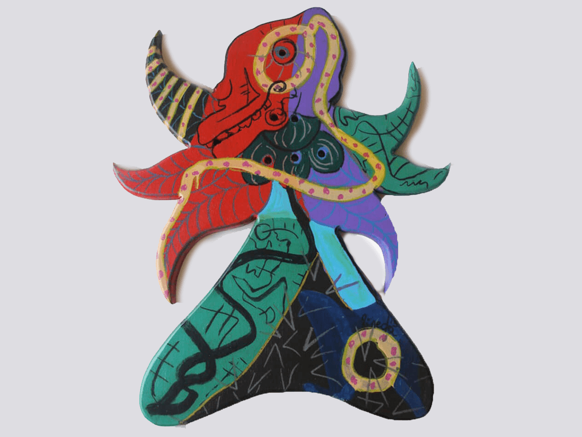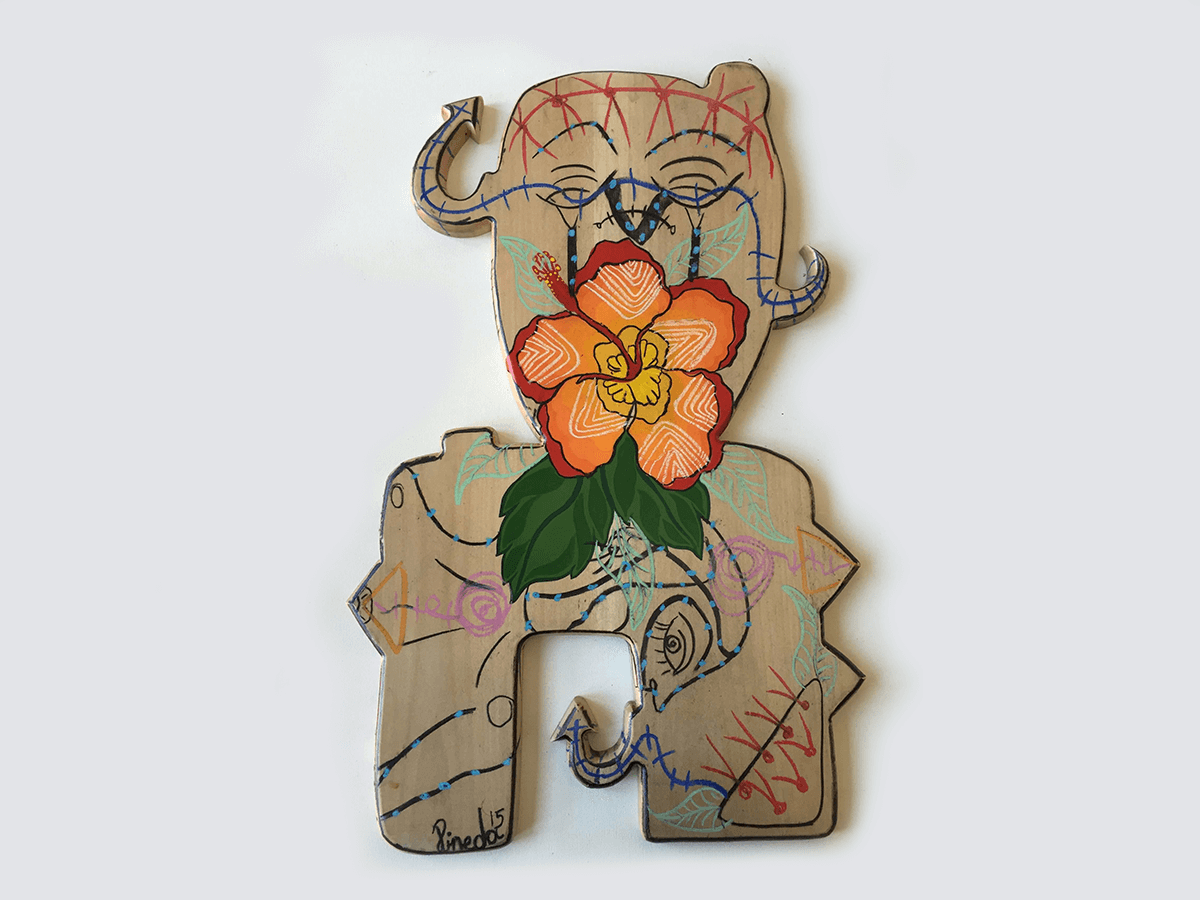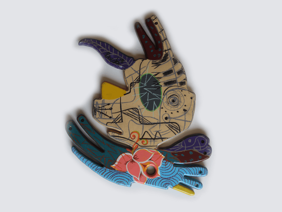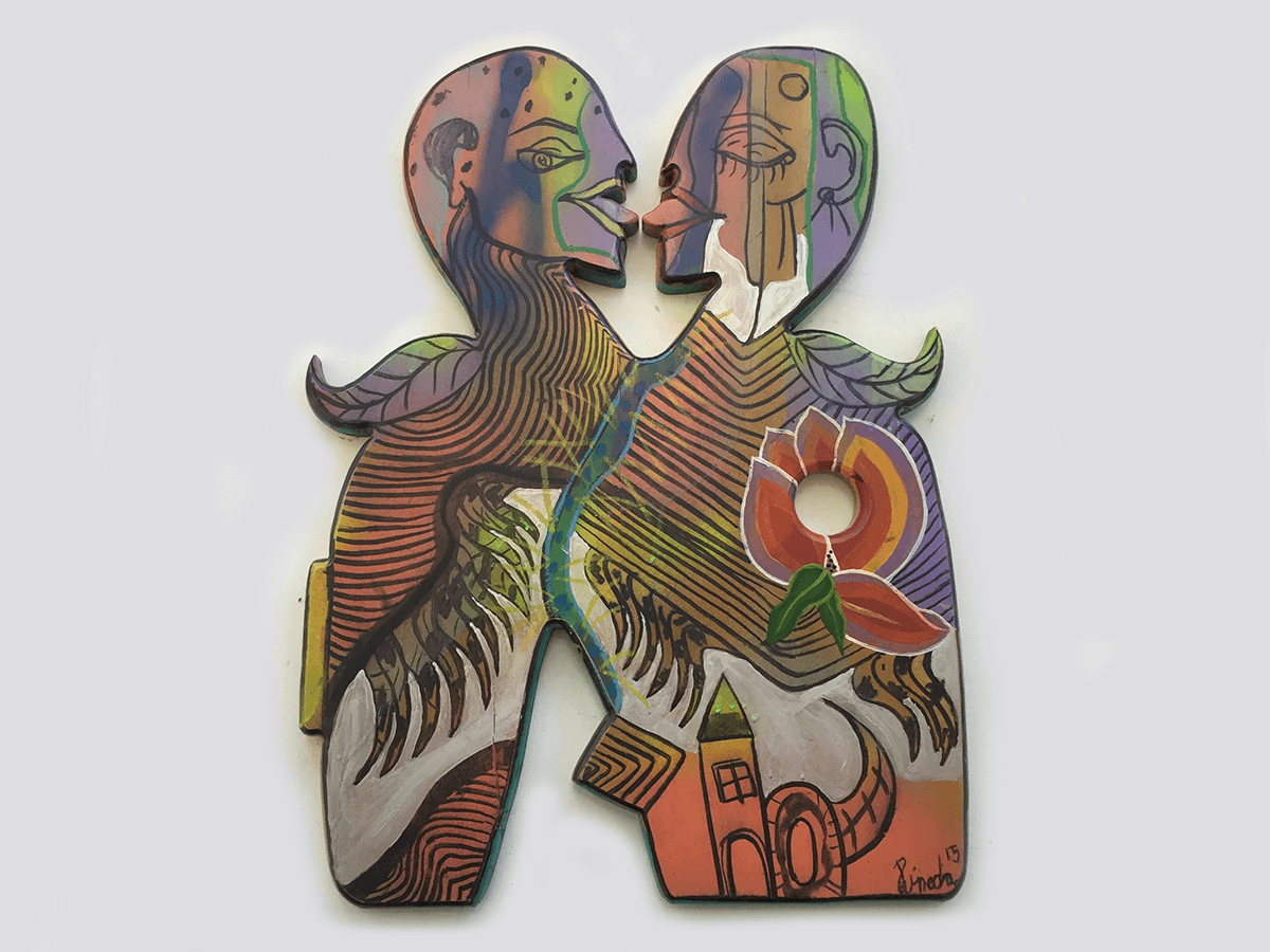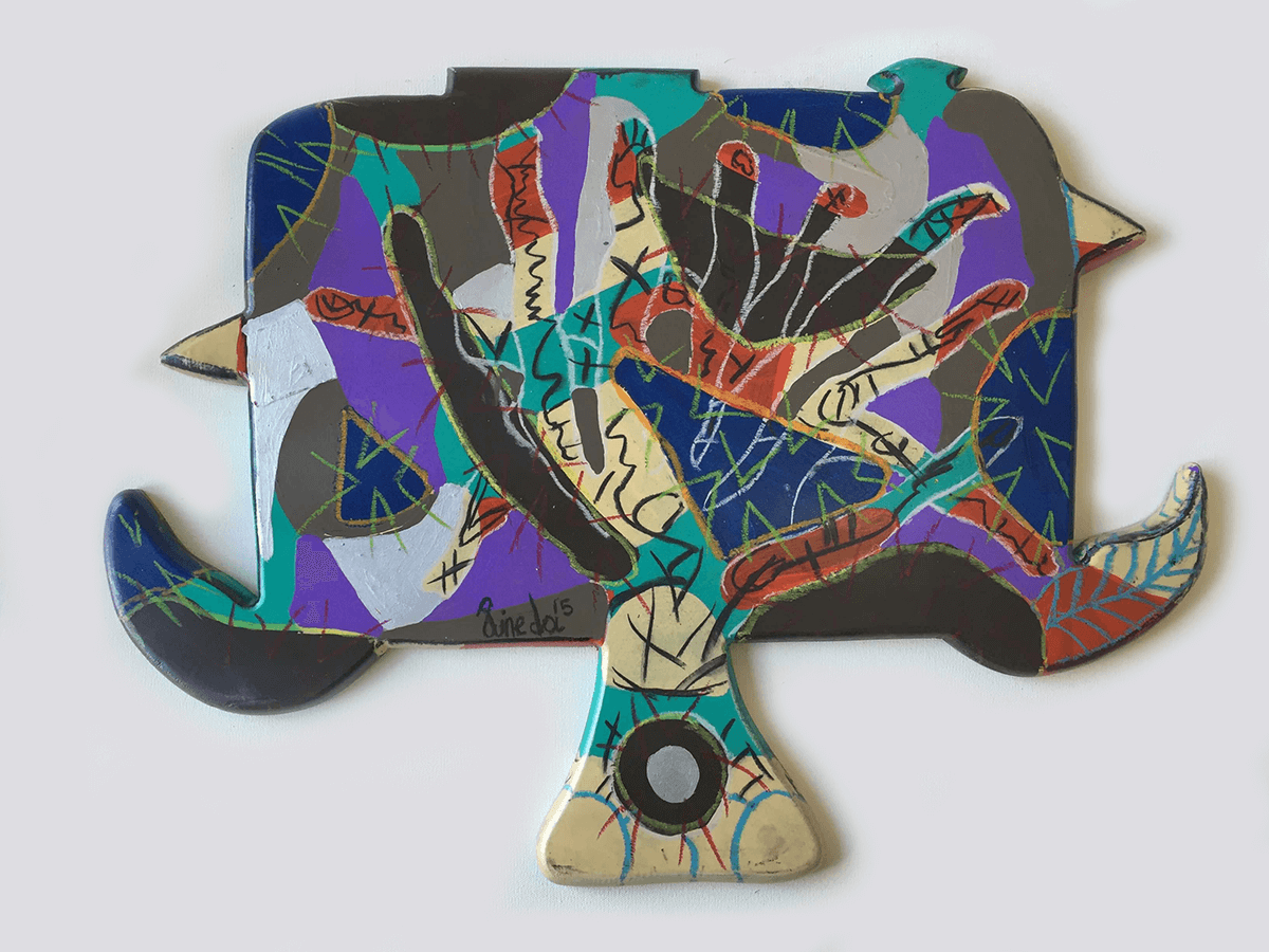 Un busto, un ojo, un volcán, una casa, éstas son unas de las tantas imágenes que se apropió el pintor en sus numerosas obras y que guían la lectura artística de su trabajo. Cristian nos explica que son “personajes recurrentes. Los tomé, los saqué de la pintura y los puse a esta superficie de pintura cortada”[1]. Éstas 400 piezas son un proyecto que ofrece un cierto parámetro de hacia dónde va el trabajo del pintor. Es como el origen, la semilla.