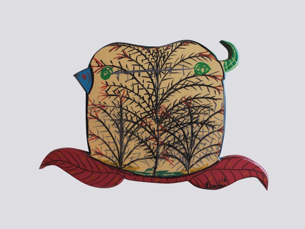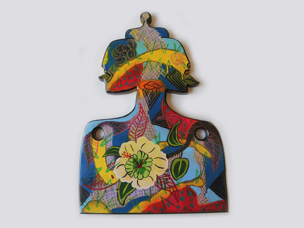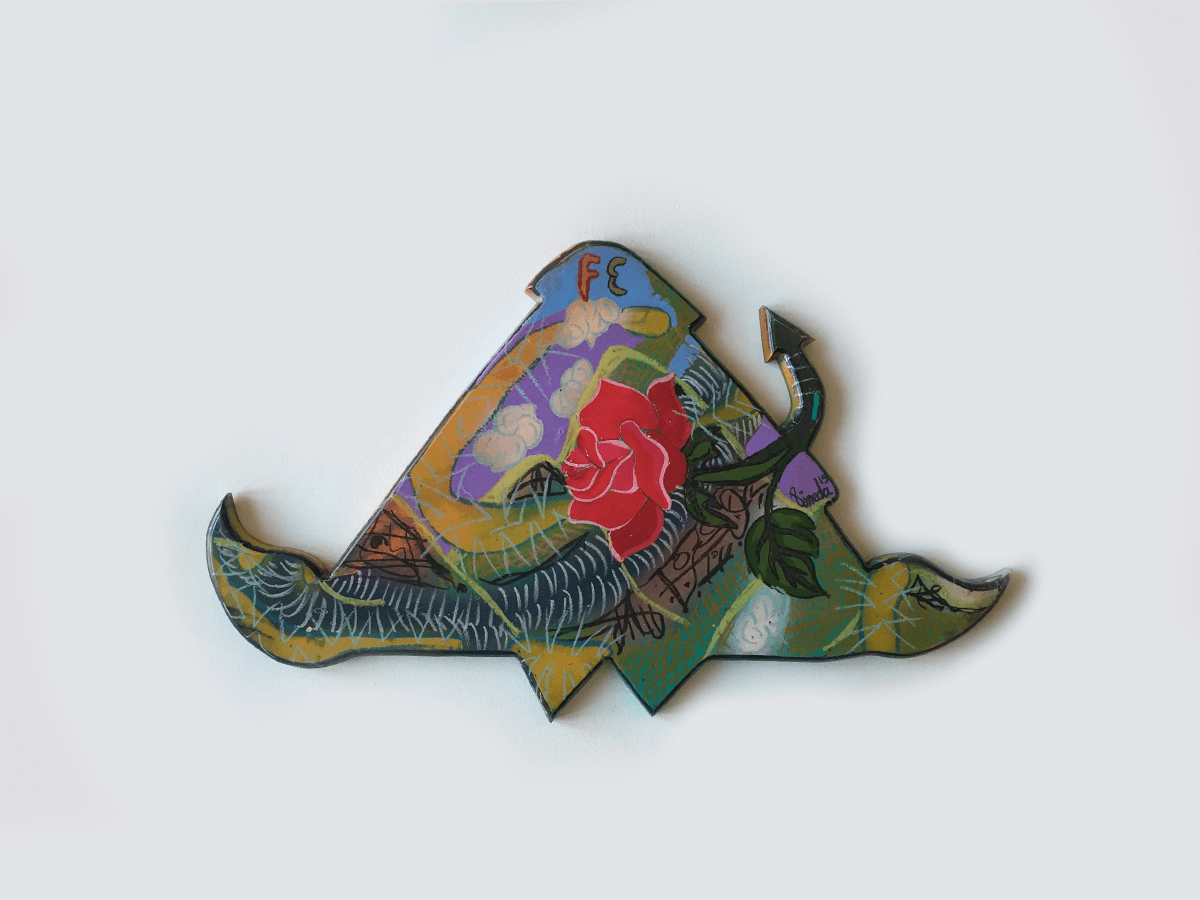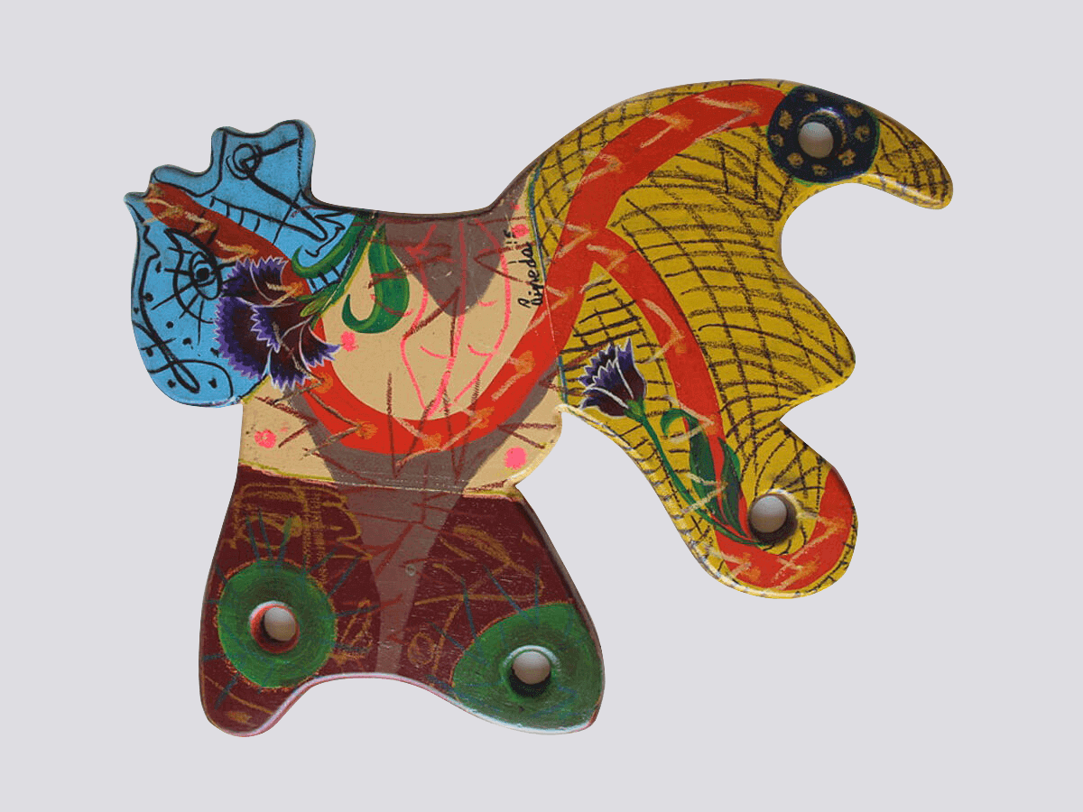 Un busto, un ojo, un volcán, una casa, éstas son unas de las tantas imágenes que se apropió el pintor en sus numerosas obras y que guían la lectura artística de su trabajo. Cristian nos explica que son “personajes recurrentes. Los tomé, los saqué de la pintura y los puse a esta superficie de pintura cortada”[1]. Éstas 400 piezas son un proyecto que ofrece un cierto parámetro de hacia dónde va el trabajo del pintor. Es como el origen, la semilla.